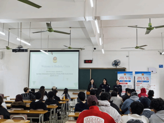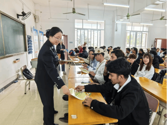 讲座内容全面实用,涵盖了在华学习生活的关键领域。警官们首先介绍了中国、广西及贺州市的概况,随后详细讲解了出入境与签证管理规定、常见违法情形,并重点普及了禁毒防艾、交通安全、宗教政策、防范电信诈骗以及在华生活注意事项等知识,为国际学生生活提供了清晰的指导。